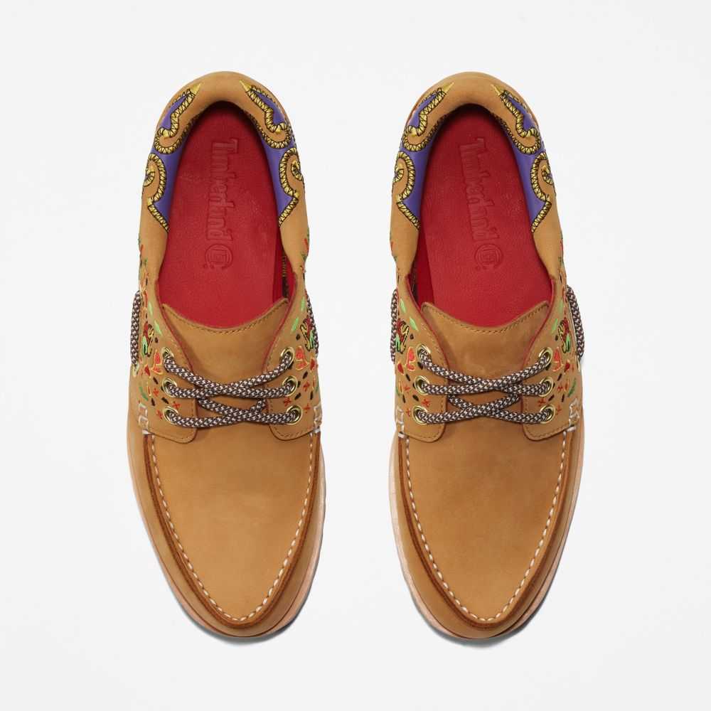Hong Kong fashion label CLOT and Timberland have collaborated to bridge East to West.CLOT cofounder Edison Chen adds Asian-inspired designs and details to new and classic Timberland® styles,reflecting the best of both brands.Together we've reimagined our classic 3-eye boat shoe with color and Eastern-inspired silk embroidery.